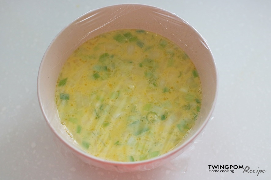 그릇에 계란물을 담고 비닐 랩으로 덮은 후, 비닐 상단에 작은 구멍을 몇 개 내줘요. 전자레인지에 넣고 약 4분 동안 돌려줘요. 중간에 젓가락으로 찔러보아 잘 익었는지 확인해 주세요. 전자레인지의 성능에 따라 시간이 다를 수 있으므로, 필요하게되면 조금 더 돌려줘요.